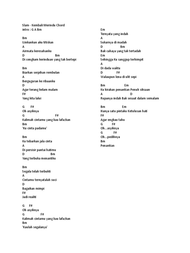 Kembali Merindu song from the album Kembali Merindu is released on Mar 2015. Jika ada sebarang masalah tentang chord lagu diatas sila buat aduan pada Form Report Chord yang disediakan. Listen to Slam Kembali Merindu MP3 song.